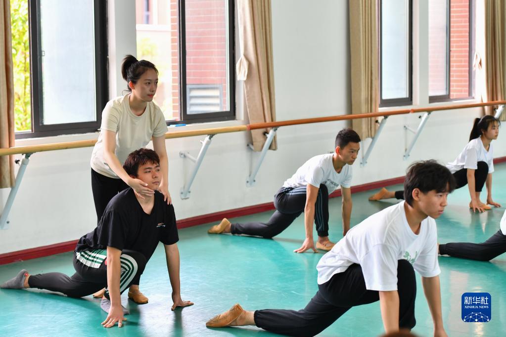 在長(cháng)沙職業(yè)技術(shù)學(xué)院特殊教育學(xué)院的舞蹈房里,鄧蕓虹(左一)幫助學(xué)生矯正熱身姿勢(9月7日攝)。