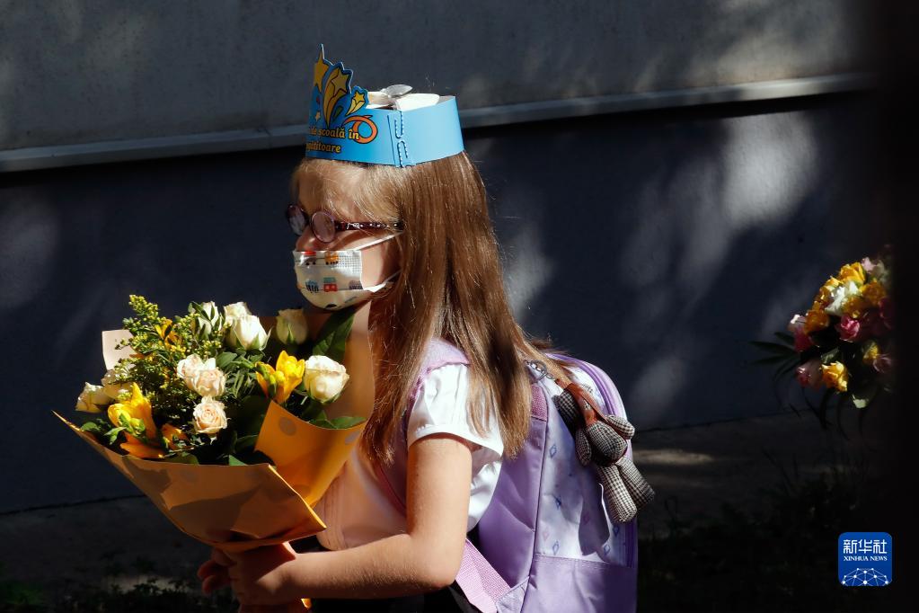 9月13日,在羅馬尼亞首都布加勒斯特,一名小學(xué)生進(jìn)入學(xué)校參加新學(xué)期開(kāi)學(xué)典禮。當日,羅馬尼亞全國中小學(xué)開(kāi)學(xué),由于疫情日趨嚴重,政府要求所有人員必須戴口罩。