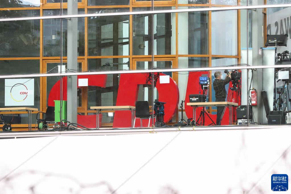 9月25日,一名媒體工作人員在德國首都柏林的德國基督教民主聯(lián)盟(基民盟)總部?jì)冗M(jìn)行準備工作。