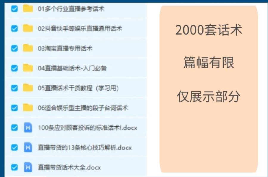 記者在某電商平臺搜索“直播帶貨話(huà)術(shù)”“直播帶貨劇本”等關(guān)鍵詞,發(fā)現相關(guān)的教學(xué)課程、話(huà)術(shù)腳本等商品有上千種,其中不少銷(xiāo)量超過(guò)3000件。記者找到一款描述為“帶貨話(huà)術(shù)腳本寫(xiě)作”的商品,在花費18.8元購買(mǎi)后,對方提供了“主播基礎必備的幾百條話(huà)術(shù)”“帶貨劇本案例”等文檔。文檔中提到,要用大讓利、大紅包留住觀(guān)眾,在這之后不要急于賣(mài)商品,而是用大嗓門(mén)、快語(yǔ)速盡可能推銷(xiāo)店鋪內其余商品,給觀(guān)眾反復洗腦,激發(fā)購買(mǎi)沖動(dòng)。