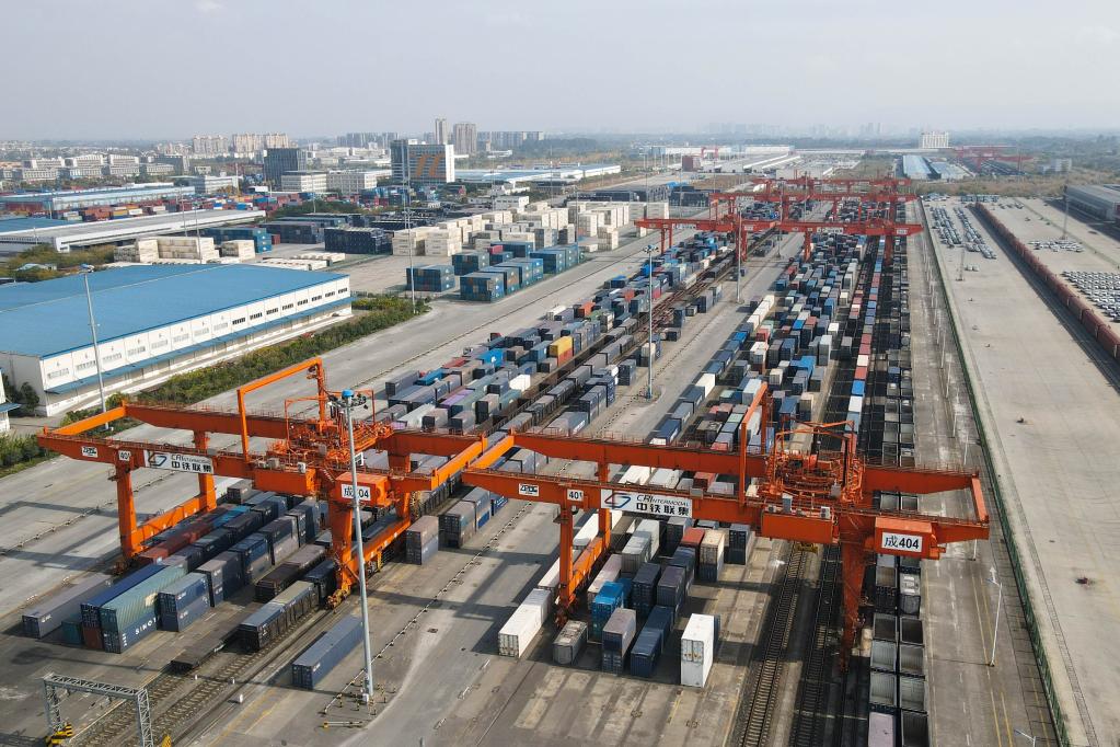 這是11月23日拍攝的四川省成都市青白江區的成都國際鐵路港(無(wú)人機照片)。新華社記者胥冰潔攝