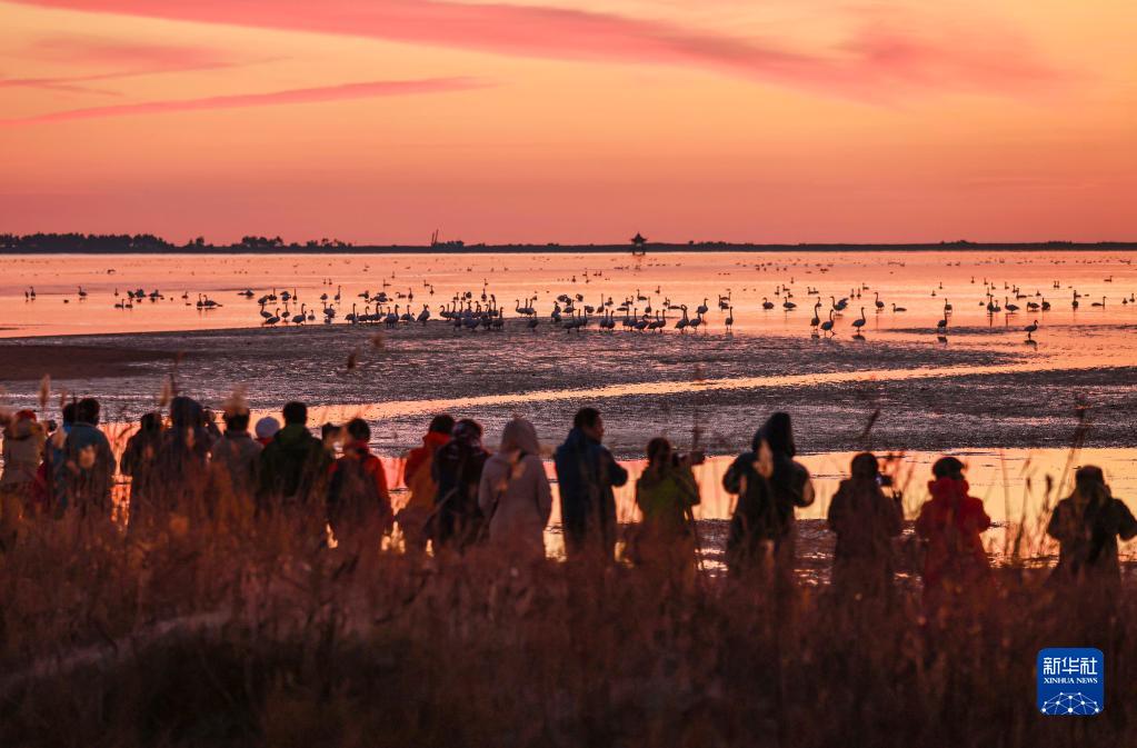 11月28日,在山東省榮成市大天鵝國家級自然保護區的一處湖畔,市民和攝影愛(ài)好者在觀(guān)賞大天鵝。