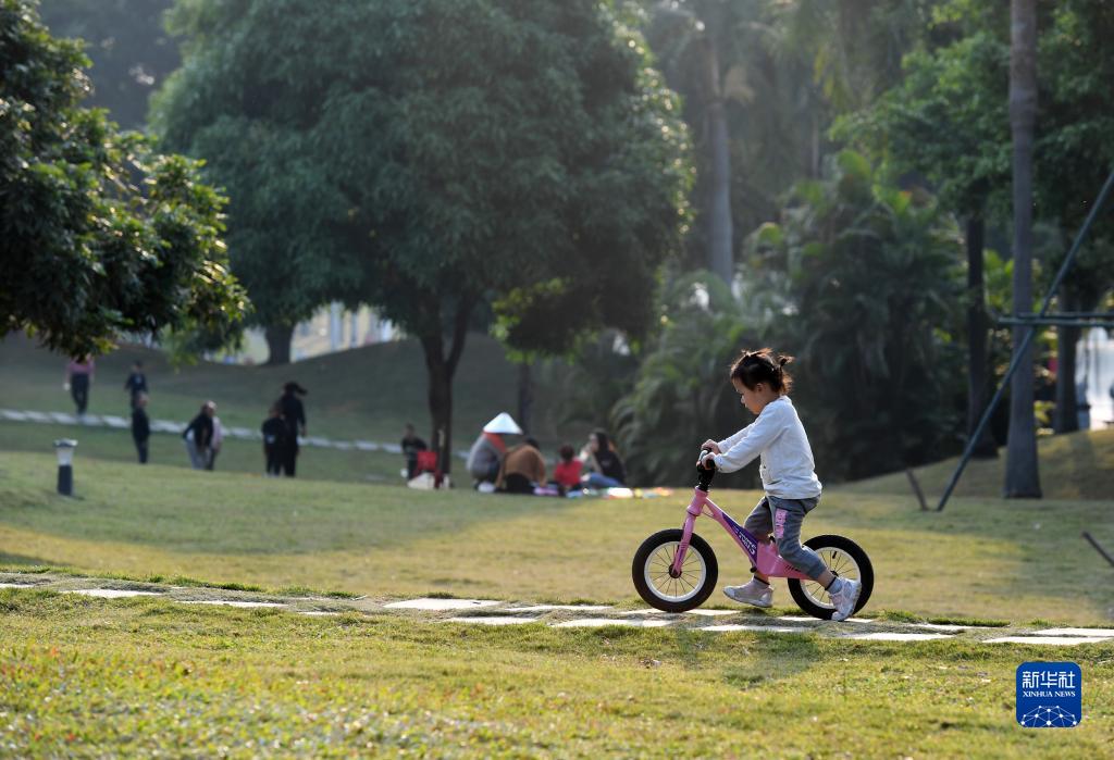 12月11日,在廣西南寧市南湖邊,一名小朋友在騎車(chē)。