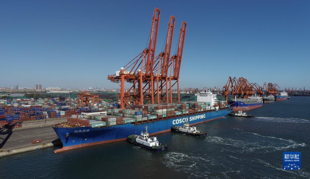10月23日,一艘輪船在拖輪的協(xié)助下向唐山港京唐港區集裝箱碼頭靠泊(無(wú)人機照片)。新華社記者 朱旭東 攝