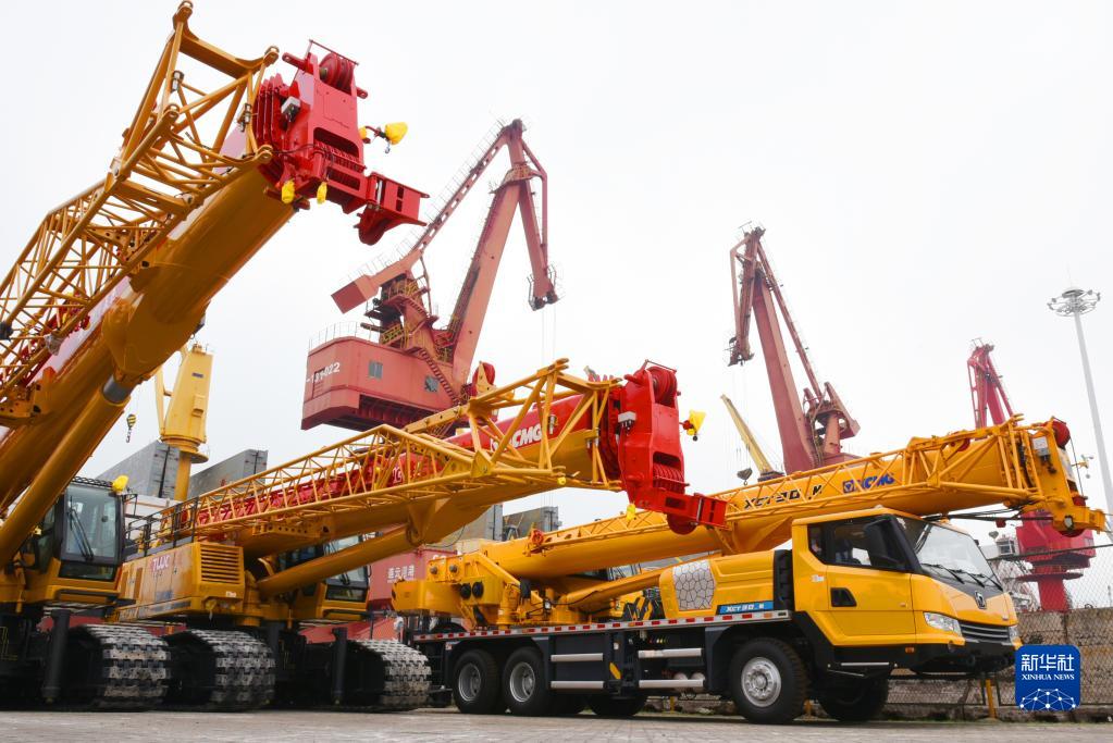 一批工程機械設備在江蘇連云港港口碼頭集結等待裝船出口(5月31日攝)。新華社發(fā)(耿玉和 攝)