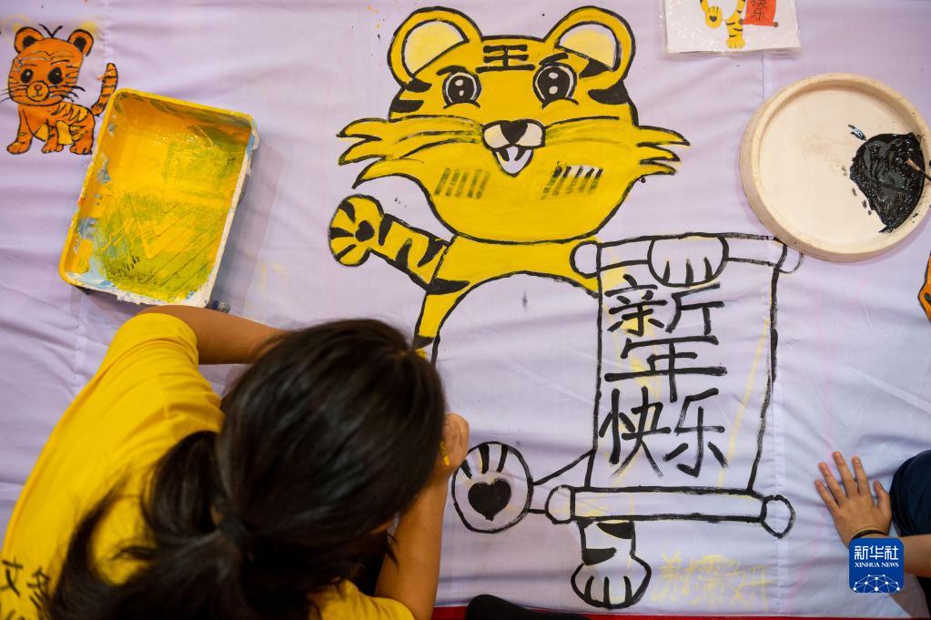 12月26日,學(xué)生們在馬來(lái)西亞彭亨州文冬創(chuàng )作老虎主題年畫(huà)。