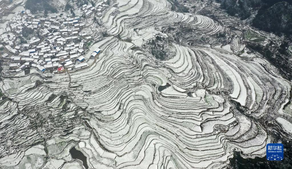 12月28日拍攝的貴州省丹寨縣龍泉鎮高要村雪后苗寨梯田景色(無(wú)人機照片)。