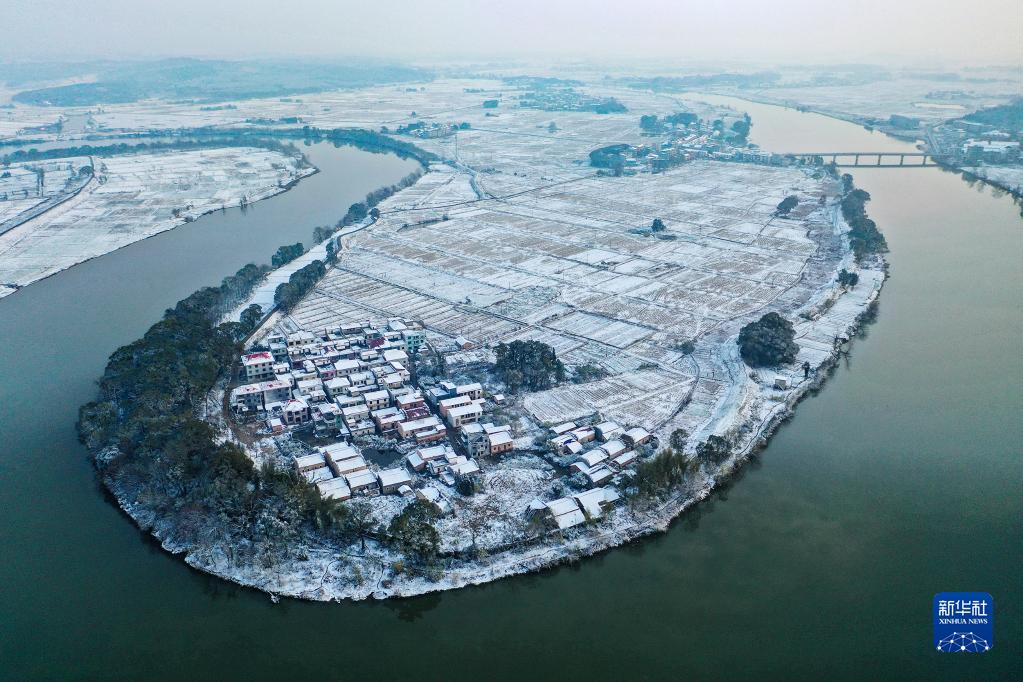 12月27日拍攝的江西省宜春市上高縣新界埠鎮的雪景(無(wú)人機照片)。