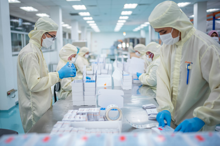 2021年10月5日,在馬來(lái)西亞吉隆坡郊區的發(fā)馬公司灌裝工廠(chǎng),工人在包裝本地灌裝生產(chǎn)的科興疫苗。新華社記者朱煒攝