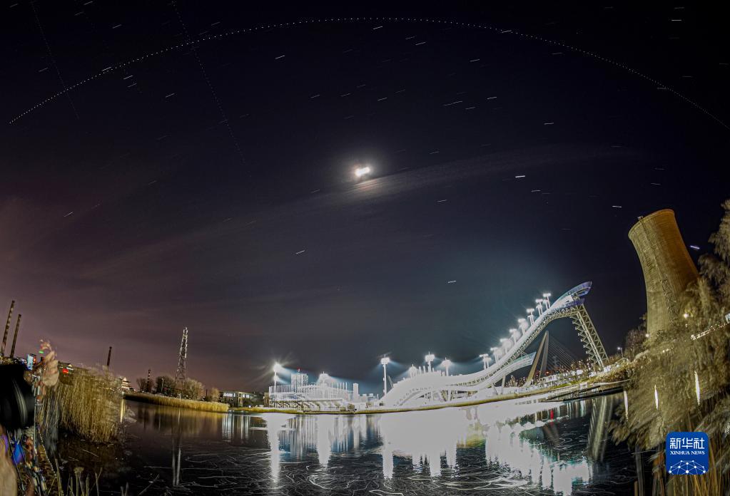2021年12月11日,在北京首鋼滑雪大跳臺旁拍攝的中國空間站過(guò)境照片(軌跡為多張照片堆棧)。
