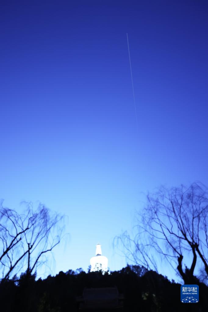 2021年12月18日拍攝的中國空間站從北京北海白塔上空飛過(guò)的照片(軌跡為多張照片堆棧)。