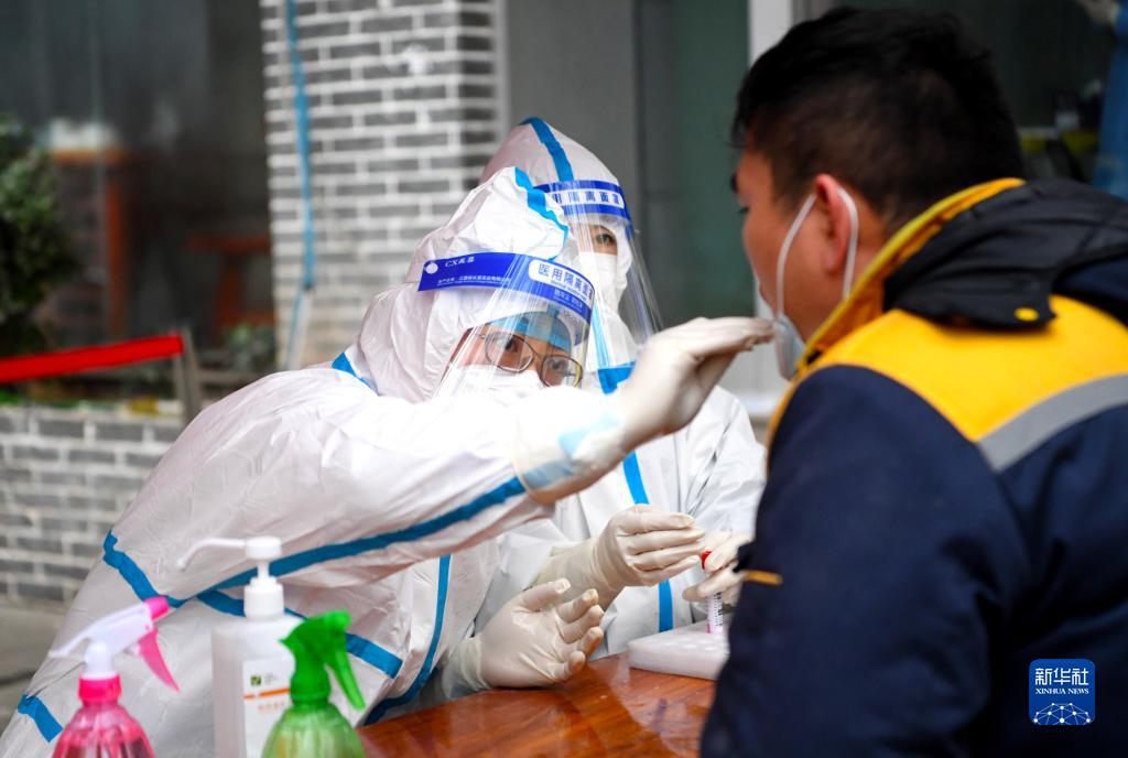 1月10日,在鄭州市緯一路一核酸檢測點(diǎn),市民在接受核酸檢測取樣。