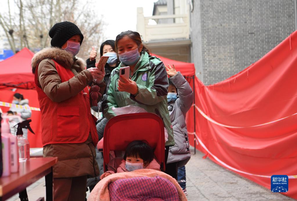 1月8日,在鄭州市金水區花園路街道一核酸檢測點(diǎn),志愿者協(xié)助市民進(jìn)行掃碼登記。