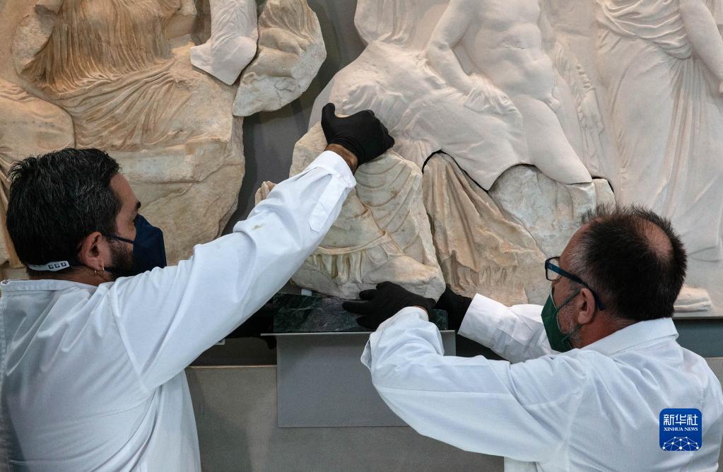 1月10日,在希臘雅典衛城博物館,工作人員正在將一塊原保存于意大利一家博物館的雅典衛城帕特農神廟石雕碎片放回原位。