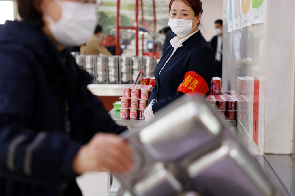 在某中央國家機關(guān)食堂,工作人員監督提示就餐員工踐行“光盤(pán)行動(dòng)”。(新華社記者劉彬 攝)
