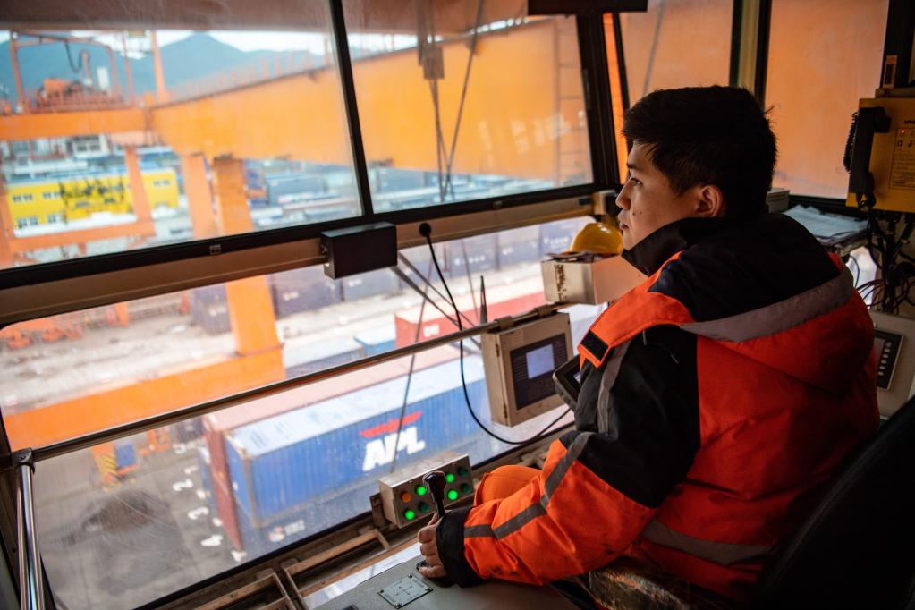 “我在正式操作龍門(mén)吊之前,在大連參加了為期6個(gè)月的培訓課程。這些年,隨著(zhù)中歐班列集裝箱的增多,我的技術(shù)也在不斷進(jìn)步?!编嵱觌p說(shuō),他剛開(kāi)始做這份工作時(shí),經(jīng)常覺(jué)得坐在這個(gè)小房間里很無(wú)聊,因為當時(shí)沒(méi)有多少貨物可供裝卸。但是后來(lái),他每天的工作量從60個(gè)集裝箱增加到250個(gè),最多時(shí)一晚上裝卸了350個(gè)集裝箱。