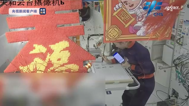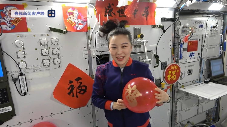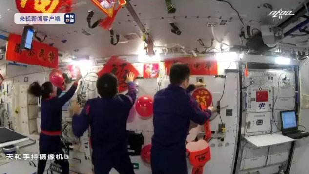 貼著(zhù)福字的中國結、春字形的掛飾和春聯(lián),各種春節元素將空間站裝點(diǎn)得喜氣洋洋、紅紅火火。因為太空中特有的微重力環(huán)境,我們看到中國結的紅色流蘇懸空自由飄舞。充滿(mǎn)現代科技感的中國空間站和中國傳統的年節習俗完美融合、相得益彰。