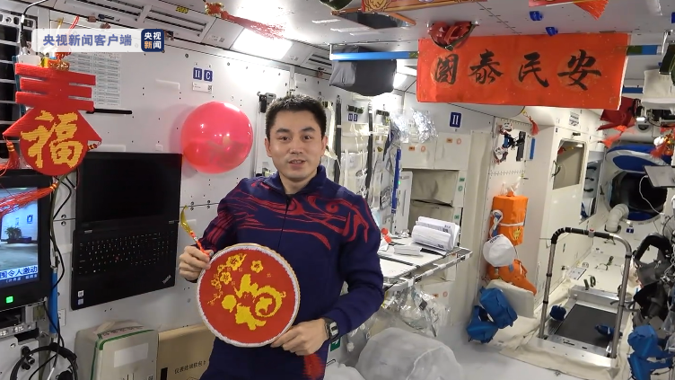 貼春聯(lián) 秀書(shū)法 航天員太空中喜迎春節