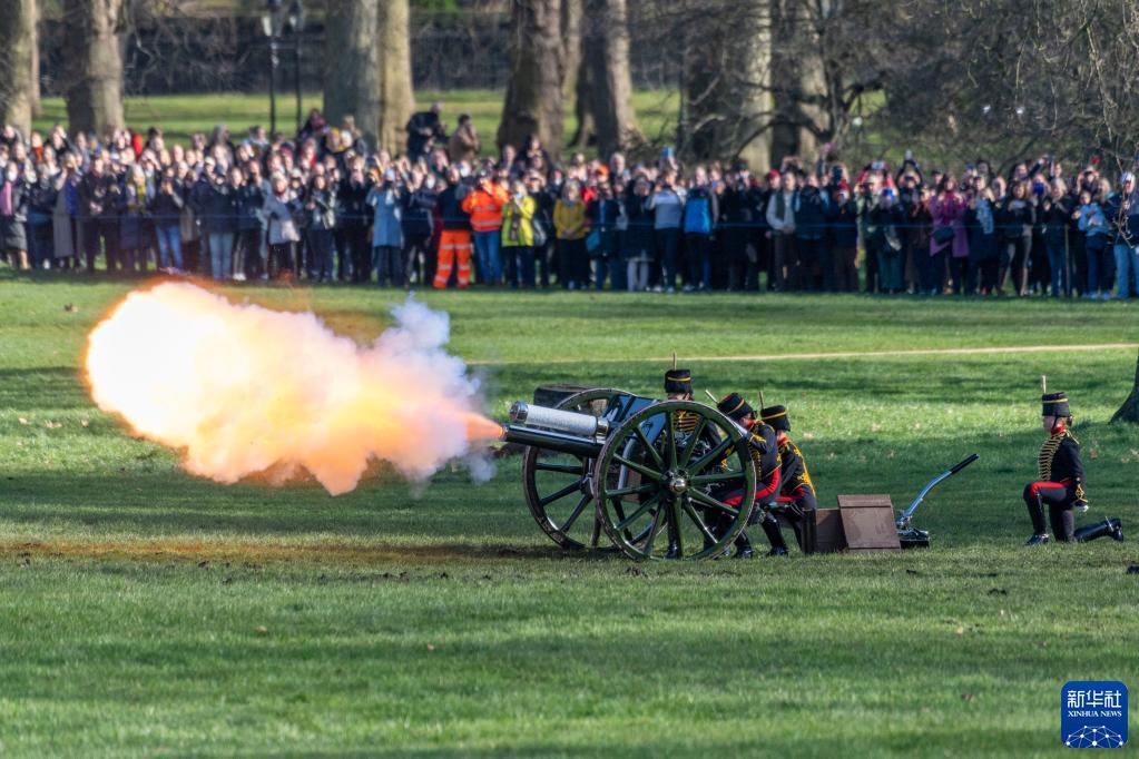 2月7日,英國士兵在倫敦白金漢宮旁的格林公園鳴放禮炮,慶祝女王伊麗莎白二世登基70周年。