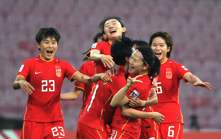 2月6日,中國隊球員在2022女足亞洲杯決賽后慶祝。新華社發(fā)(賈韋德·達爾攝)