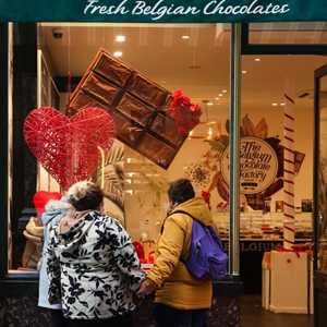 2月8日,在比利時(shí)布魯塞爾的一家巧克力商店櫥窗外,人們被“情人節”主題巧克力吸引。