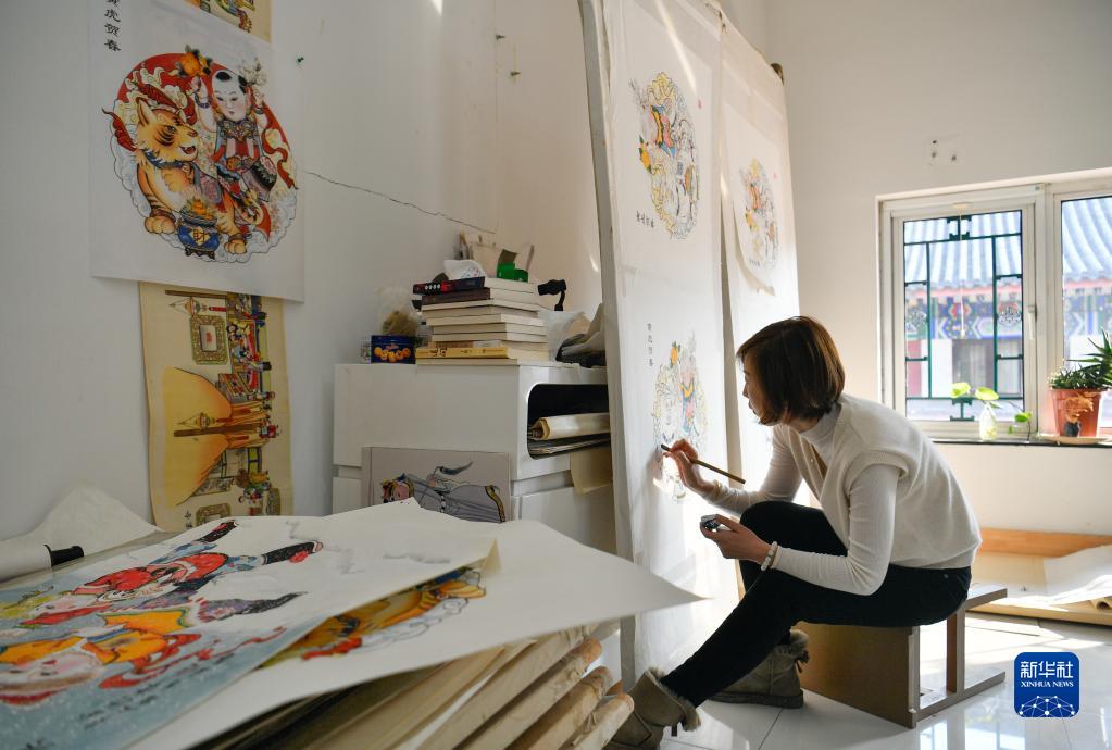 2月10日,天津楊柳青畫(huà)社青年傳承人王艷在彩繪工作室創(chuàng )作年畫(huà)。