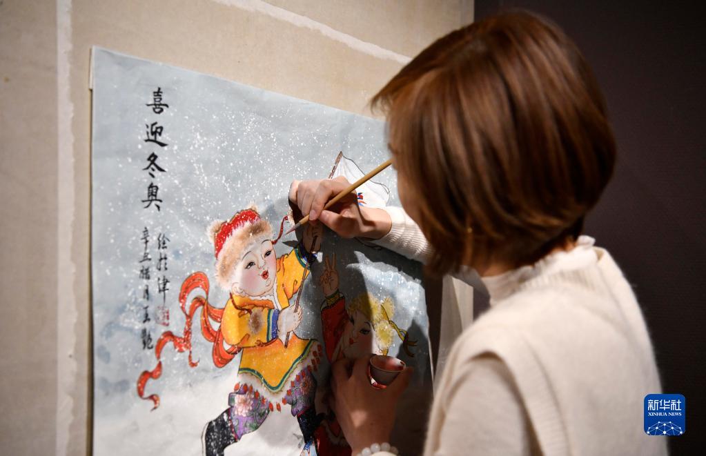 2月10日,天津楊柳青畫(huà)社的青年傳承人團隊成員在創(chuàng )作冬奧主題年畫(huà)。