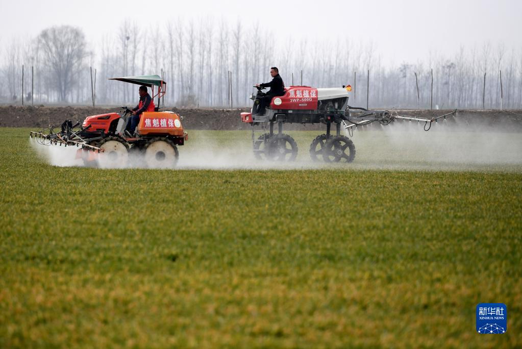 2月11日,安徽省亳州市譙城區趙橋鄉雙樓村村民駕駛機械在麥田噴灑除草劑。