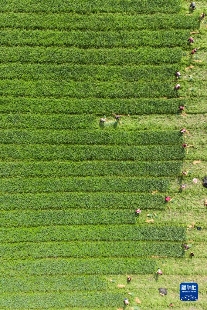 2月11日,四川省內江市東興區田家鎮火花村村民在采收蒜苗(無(wú)人機照片)。