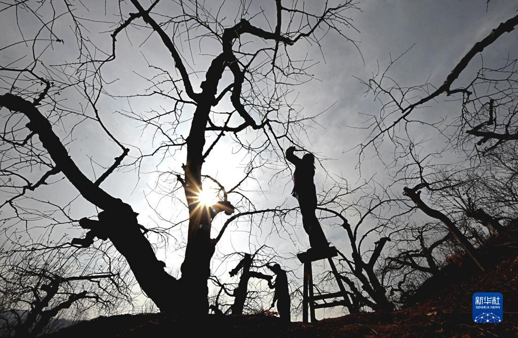2月11日,在山東省淄博市沂源縣悅莊鎮,果農在果園里修剪果樹(shù)。