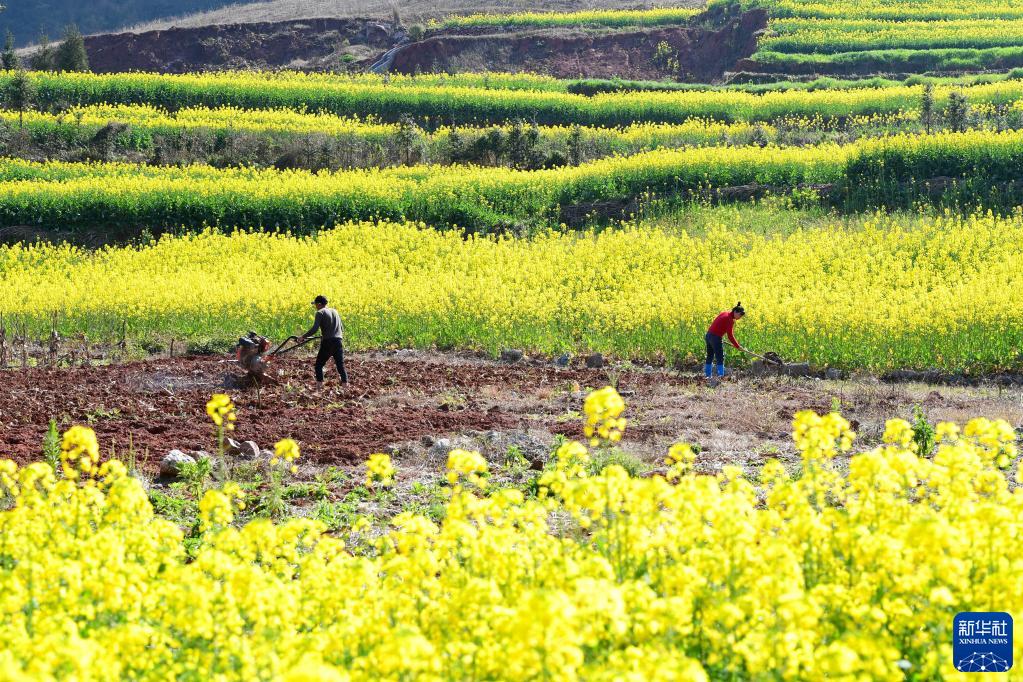 2月11日,云南省曲靖市羅平縣九龍街道拖區村的農民在田間勞作。