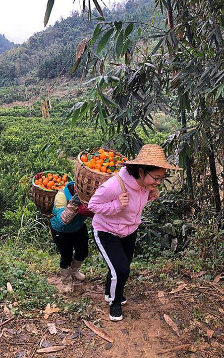 黃文秀與村民一起采摘運輸砂糖橘(資料照片)。新華社發(fā)
