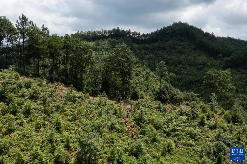 在浙江省杭州市臨安區太湖源鎮上陽(yáng)村重陽(yáng)塢,志愿者在“碳中和林”進(jìn)行日常巡查(2021年7月20日攝,無(wú)人機照片)。新華社記者 徐昱 攝