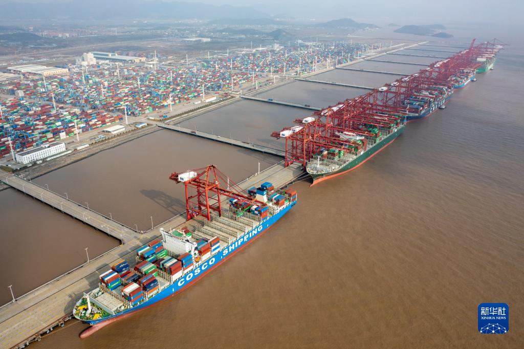 浙江寧波舟山港梅山港區集裝箱碼頭一派繁忙(2021年12月17日攝,無(wú)人機照片)。新華社發(fā)(蔣曉東 攝)
