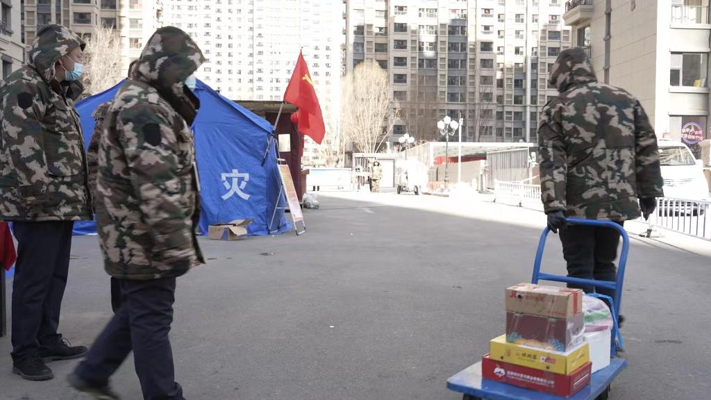 在這個(gè)封控小區門(mén)口,疫情防控工作人員高智在寒風(fēng)中查驗物資運輸車(chē)輛,他說(shuō),小區內目前有2000余戶(hù)居民,樓長(cháng)每日收集居民的物資需求,由社區聯(lián)系保供企業(yè)將物資配送到小區門(mén)口,統一消毒后送進(jìn)小區。