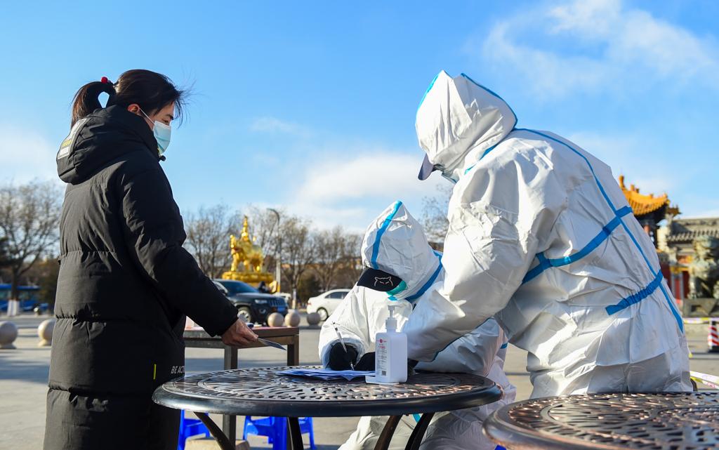 2月19日,在呼和浩特市玉泉區席力圖召臨時(shí)核酸采樣點(diǎn),工作人員登記信息。新華社記者 彭源 攝