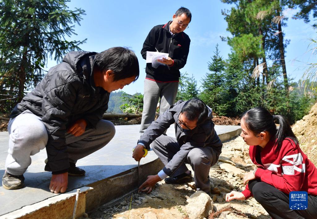 在廣西柳州市融水苗族自治縣良寨鄉培洞村,紀檢監察干部(右一、二、三)在檢查扶貧道路施工情況(2019年11月5日攝)。新華社記者 黃孝邦 攝