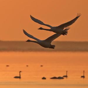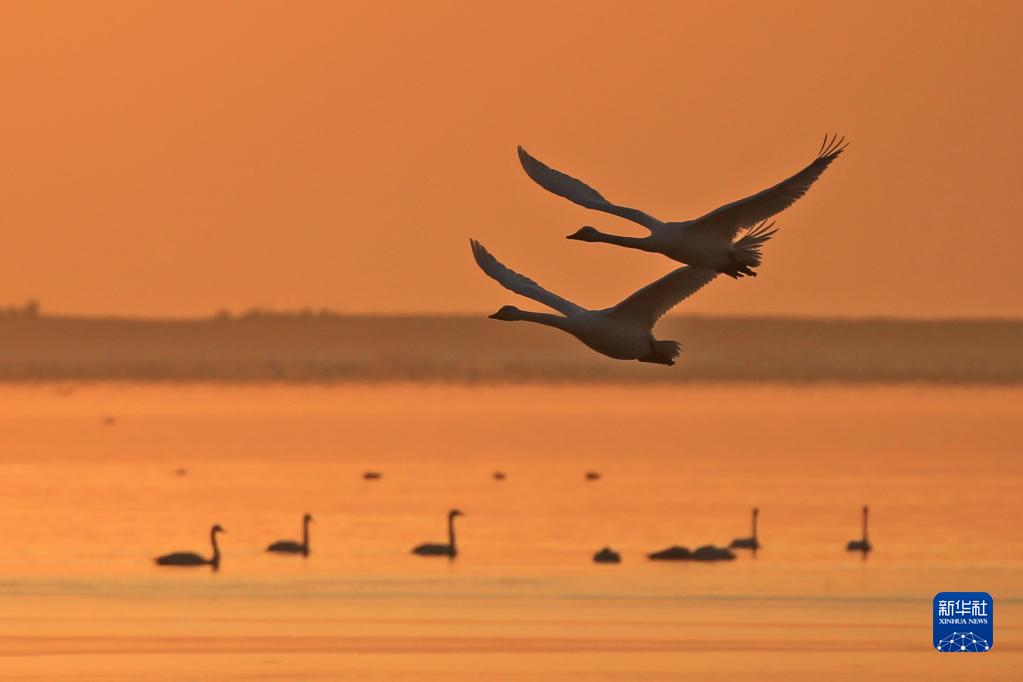 2月24日清晨,在山東榮成天鵝湖畔,兩只大天鵝在朝霞中飛舞。