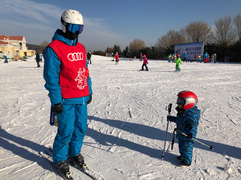↑俞佳輝在教小朋友滑雪。(受訪(fǎng)者供圖)