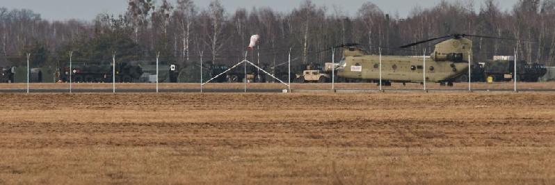 記者又驅車(chē)前往熱舒夫西北部60多公里處的梅萊茨機場(chǎng)。駛近機場(chǎng)就看到黑鷹直升機低空盤(pán)旋。在這座面積并不大的機場(chǎng)外,排隊停著(zhù)十多輛油罐車(chē),準備提供燃油供給。機場(chǎng)附近,兩名荷槍實(shí)彈的美軍士兵把守著(zhù)一座美軍軍營(yíng)。從外圍可以看到機場(chǎng)里??恐?zhù)數架黑鷹直升機和奇努克運輸直升機。