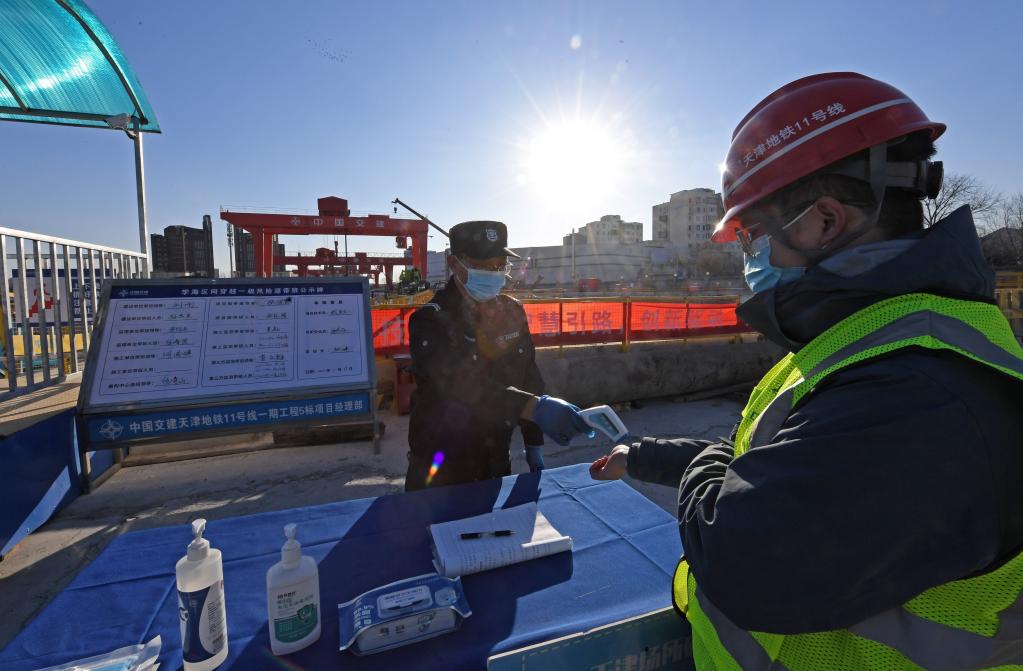 圖為1月17日,天津地鐵11號線(xiàn)5標段項目部,疫情之下地鐵建設不停歇,工作人員進(jìn)入隧道前接受體溫檢查。新華社記者 趙子碩 攝