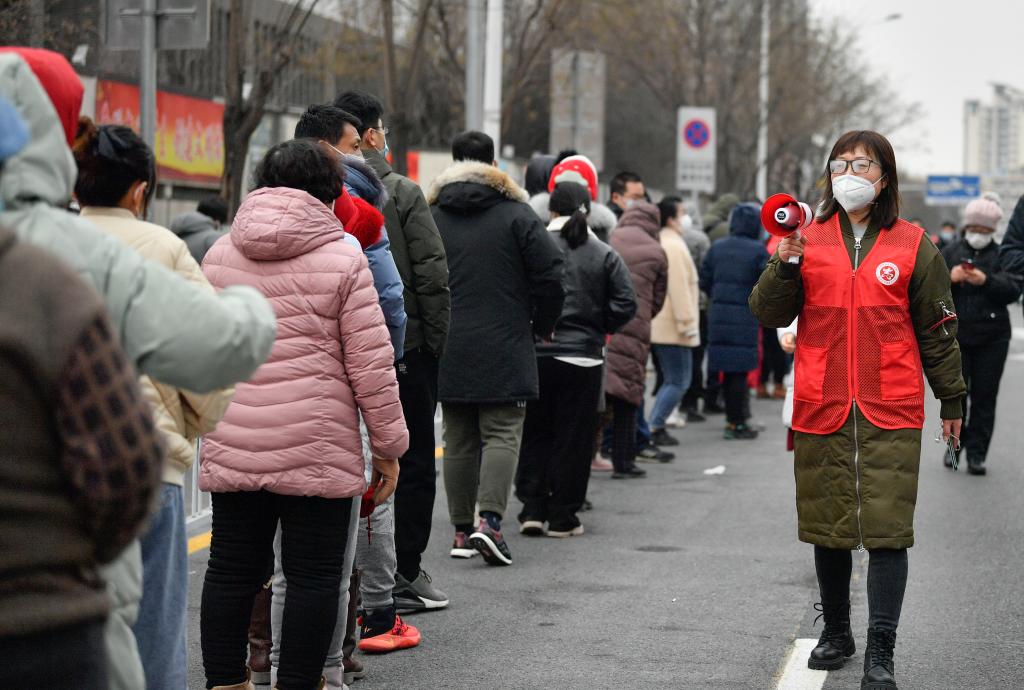 圖為1月9日,在天津市南開(kāi)區鼓樓街道一處核酸檢測點(diǎn),志愿者(右)用廣播喇叭提示市民核酸檢測注意事項。新華社記者 孫凡越 攝