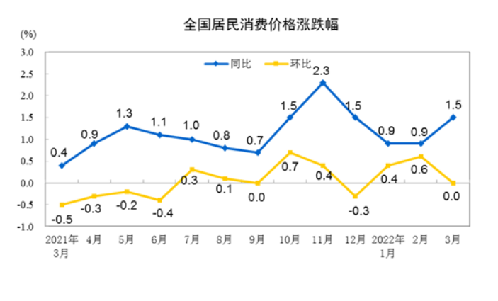 不過(guò),3月份以來(lái),受?chē)鴥榷帱c(diǎn)散發(fā)疫情和國際大宗商品價(jià)格上漲等因素影響,CPI同比漲幅有所擴大。3月份CPI同比上漲1.5%,漲幅比上月擴大0.6個(gè)百分點(diǎn)。此外,部分民生商品價(jià)格漲幅較大,如鮮菜價(jià)格由上月同比下降0.1%轉為上漲17.2%。