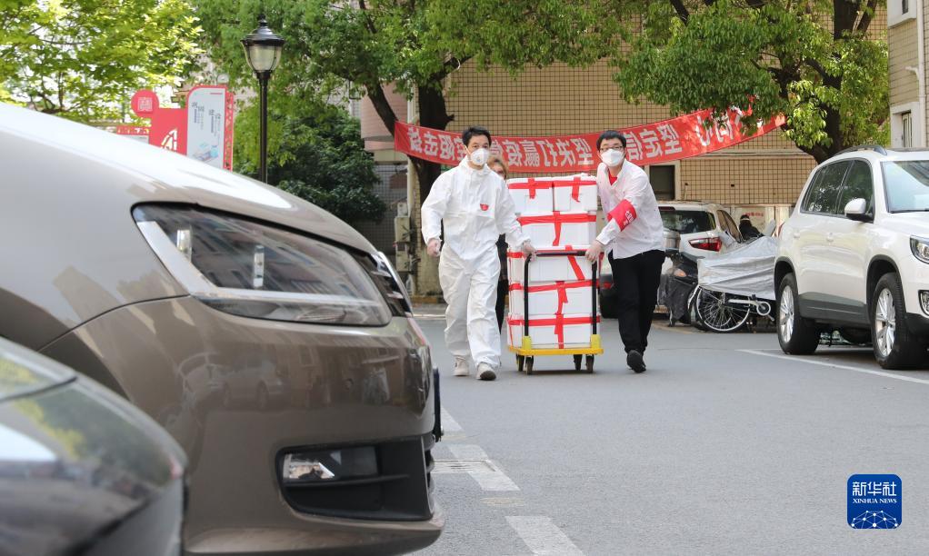 4月11日,上海市閔行區七寶鎮社區志愿者施忠良(左)與他的志愿者伙伴一起為居民派送生活物資。(新華社記者方喆 攝)