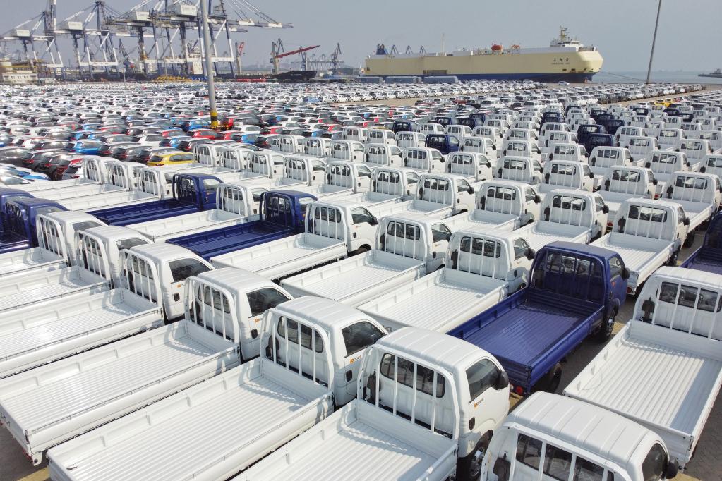 2022年3月7日,大批出口商品車(chē)在山東港口煙臺港集結等待裝船(無(wú)人機照片)。新華社發(fā)(唐克 攝)