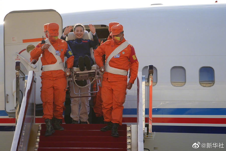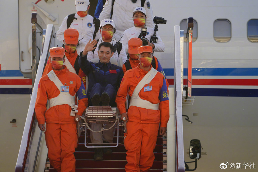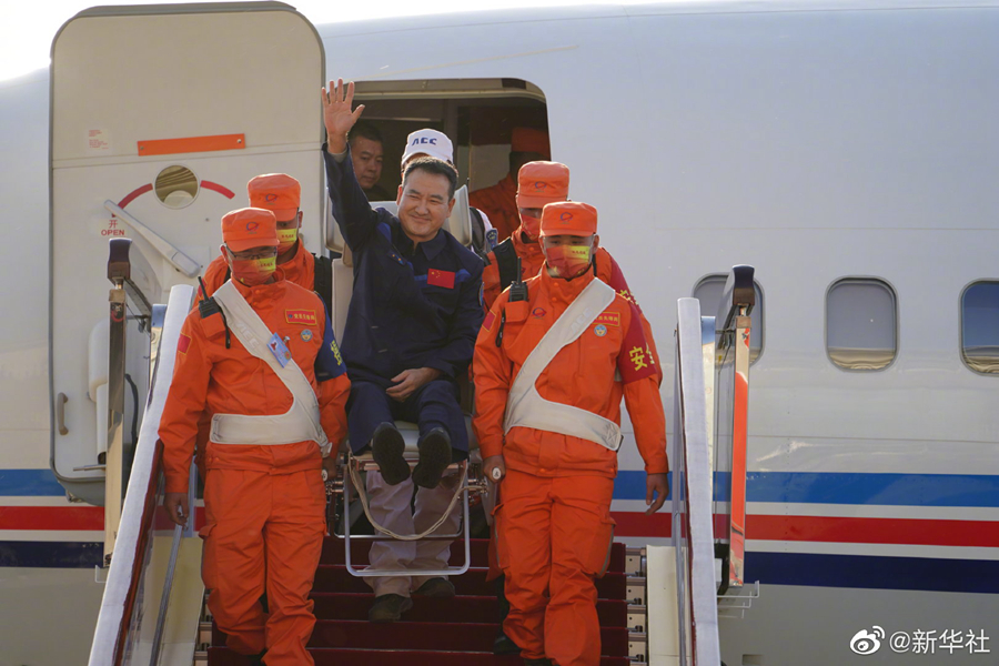 新華社北京4月16日電(記者郭明芝、田定宇)據中國載人航天工程辦公室消息,圓滿(mǎn)完成神舟十三號載人飛行任務(wù)的航天員翟志剛、王亞平、葉光富,于2022年4月16日下午乘坐任務(wù)飛機平安抵達北京??臻g站階段飛行任務(wù)總指揮部領(lǐng)導和成員到機場(chǎng)迎接。