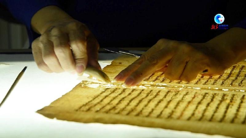 在敘利亞大馬士革老城的一間工作室里,古籍修復師拉賈·拉杰哈在發(fā)光的桌板前專(zhuān)注地修復一張破損的古籍紙張。