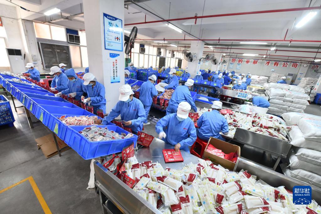 在廣西螺霸王食品有限公司生產(chǎn)車(chē)間,工人在生產(chǎn)線(xiàn)上包裝螺螄粉(4月11日攝)。新華社記者 黃孝邦 攝