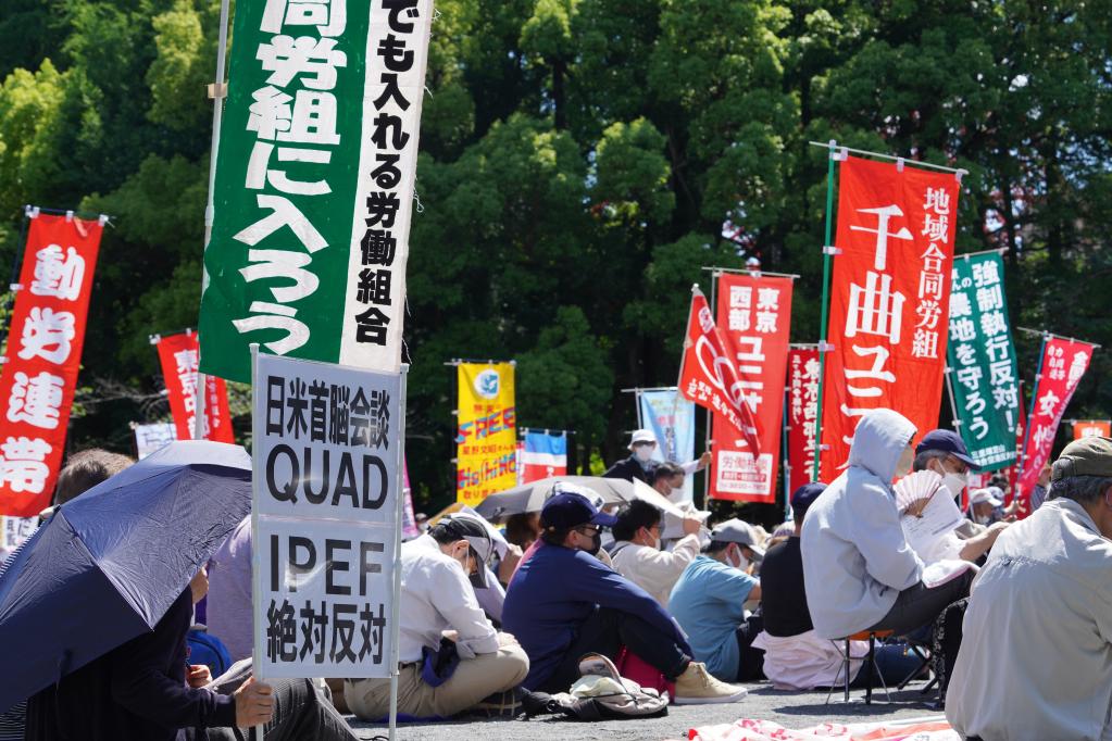 5月22日,民眾在日本東京舉行抗議集會(huì )。來(lái)自日本各地的數百名民眾22日在東京舉行集會(huì )和示威游行,抗議美國總統拜登當天開(kāi)始的訪(fǎng)日之行,抵制日美首腦會(huì )晤和美日印澳“四邊機制”峰會(huì )。(新華社記者 張笑宇 攝)