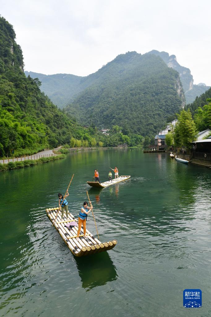 7月16日,游客在湖北省宜昌市秭歸縣三峽竹海生態(tài)景區體驗竹筏親水項目。